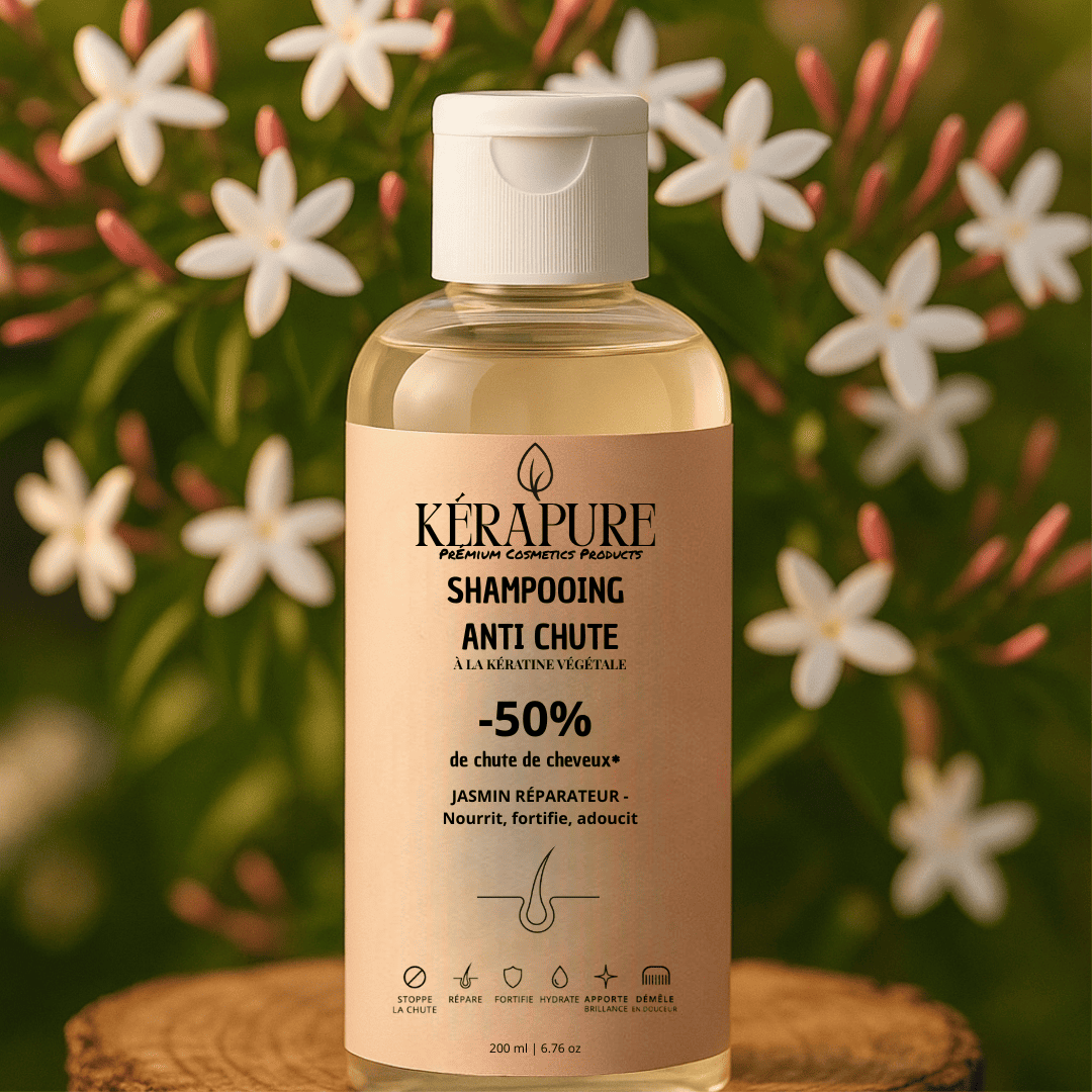 Profitez d’un soin profond avec notre shampooing sans silicone et sans parabènes, enrichi en kératine végétale et en huile essentielle de jasmin. Son parfum doux transforme chaque lavage en un moment de bien-être tout en agissant contre la chute.
